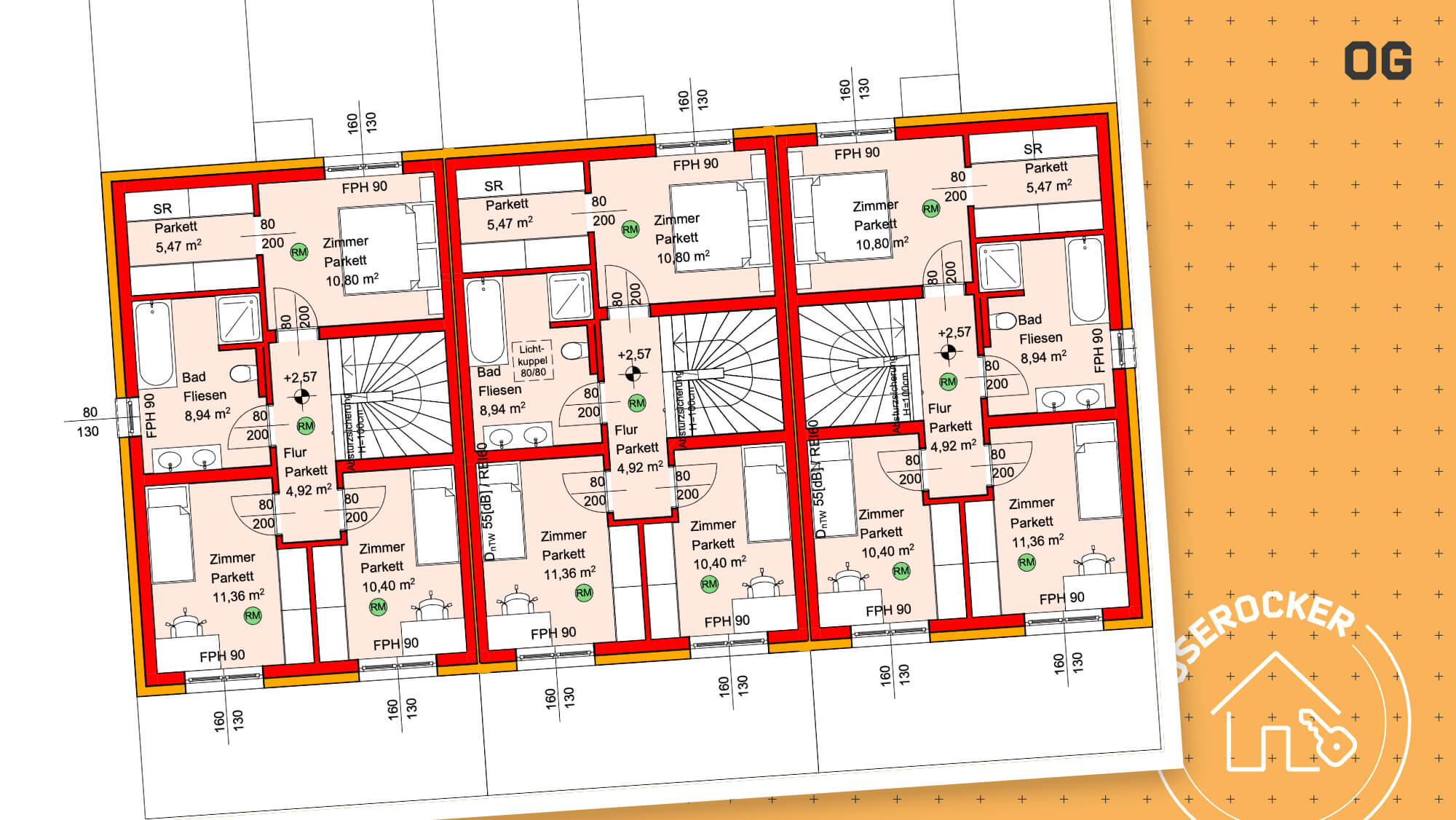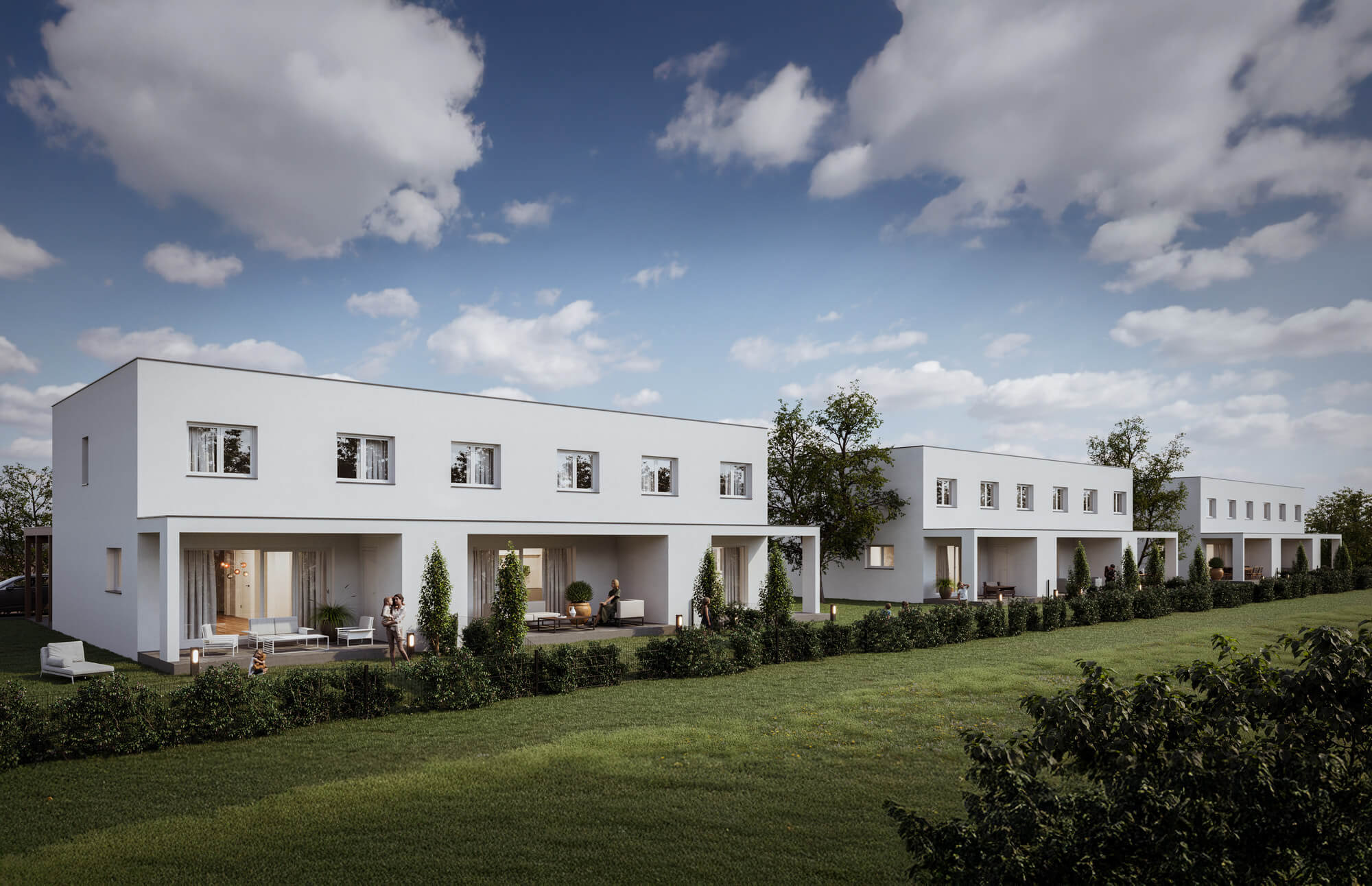 3 Reihenhäuser mit jeweils 3 Einheiten (2x Eckhaus, 1x Mittelhaus)