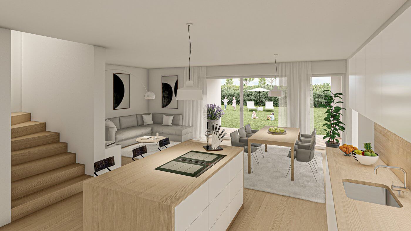 Pro Reihenhaus wird auf zwei Stockwerken mit perfekter Raumaufteilung reichlich Platz angeboten. Im Erdgeschoß befindet sich neben dem großzügigen Wohn-Essbereich auch noch eine Garderobe, ein Gäste-WC, der Technikraum und ein Abstellraum unter Stiege. Bei den Eckhäusern steht zusätzlich ein weiterer geschützter Abstellraum auf der Terrasse zur Verfügung.