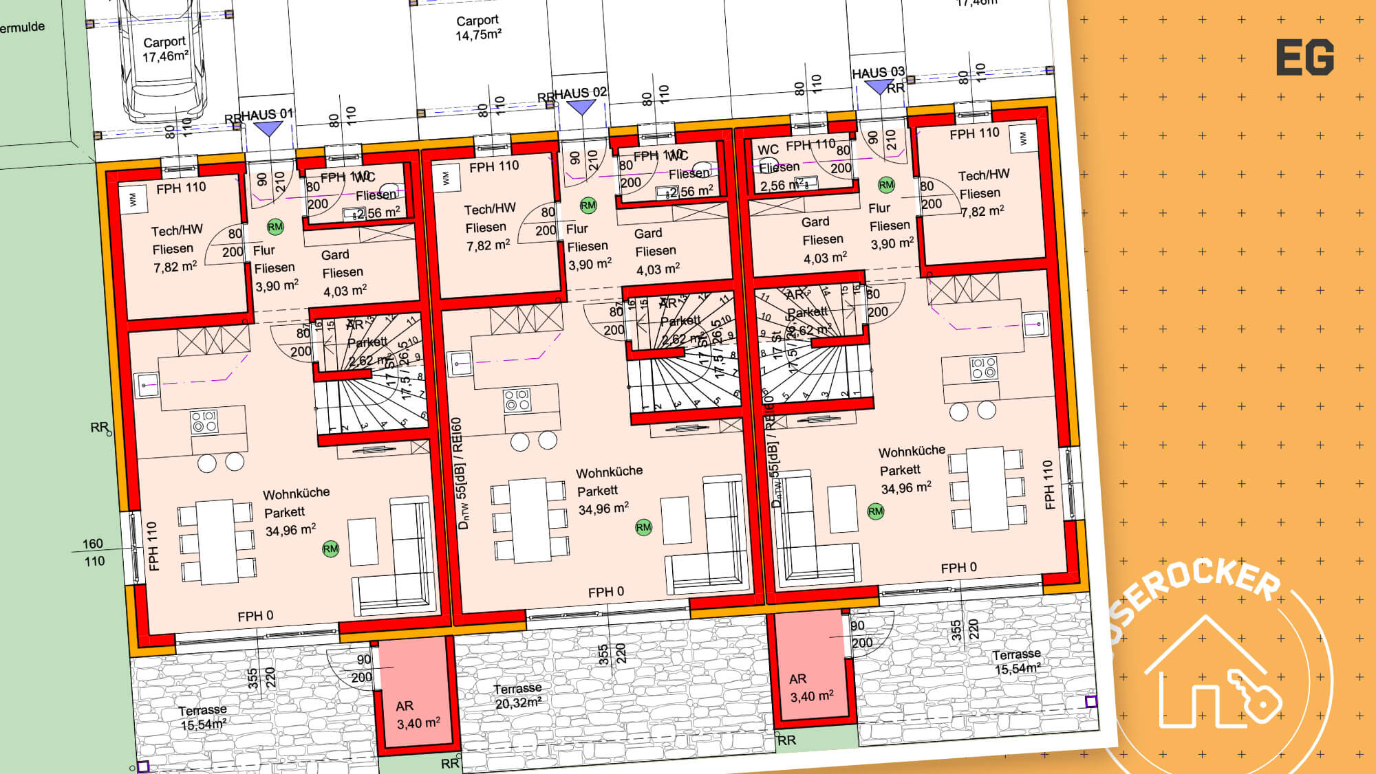EG: Garderobe, Wohn/Essbereich, Gäste-WC, Technikraum, Abstellraum